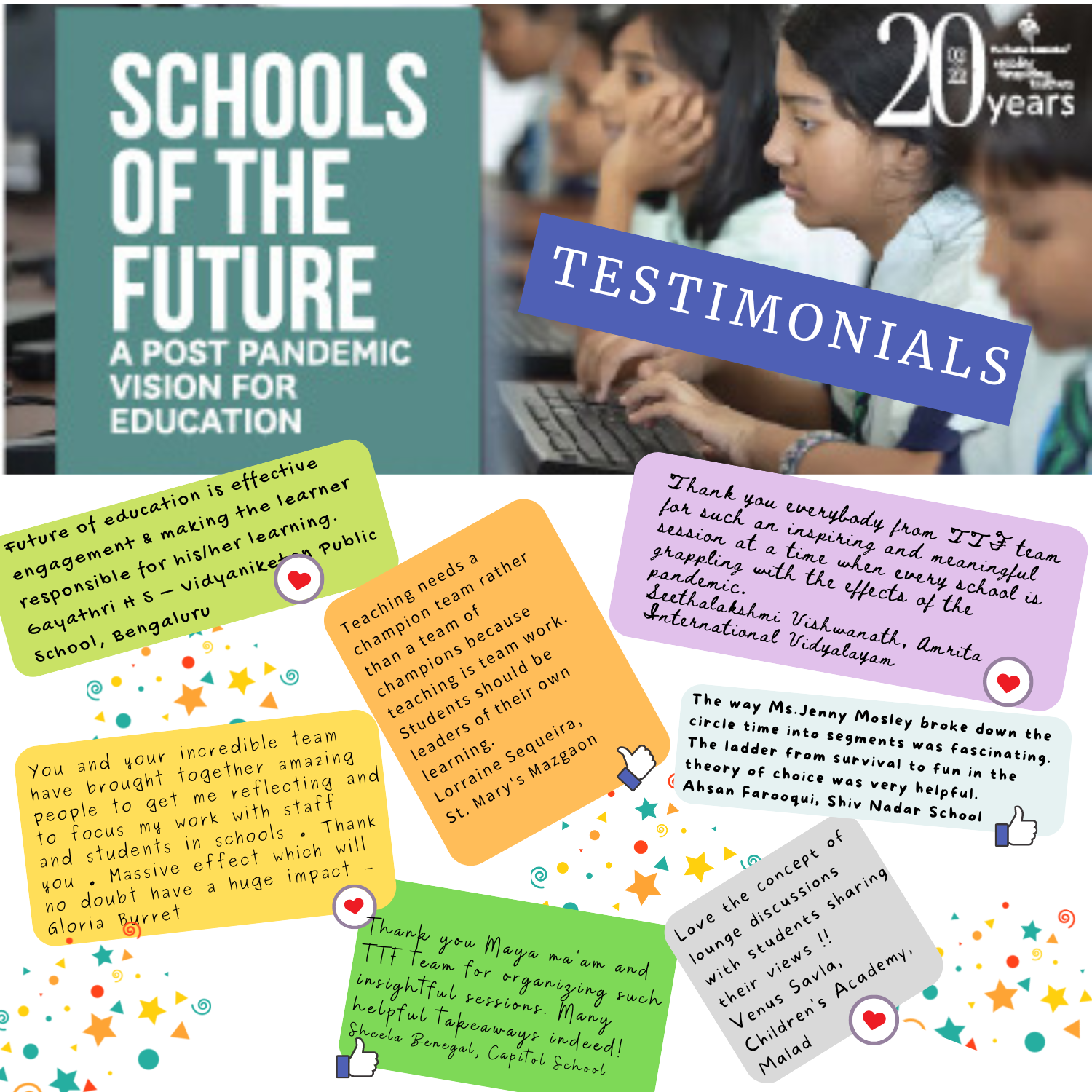 The Schools of the Future Conference, held on 20th, 21st, 27th & 28th January, 2023 saw many eminent national and international educationists speak on a variety of critical aspects of future schools. There were thoughtful and incisive Key Note addresses on Future of School Spaces, Teaching-Learning, School Leadership, School Well-being & Inclusion. Panel Discussions on Leading Schools in India, Being a Trauma-Informed School and New Paradigm of Learning offered varied provocative perspectives. Finally the Lounge Sessions where school children spoke on how THEY look at Schools of the Future offered a fresh view. The 4 days had 400+ participants hooked on how to build upon their own learnings and bring transformation in their schools & classrooms.