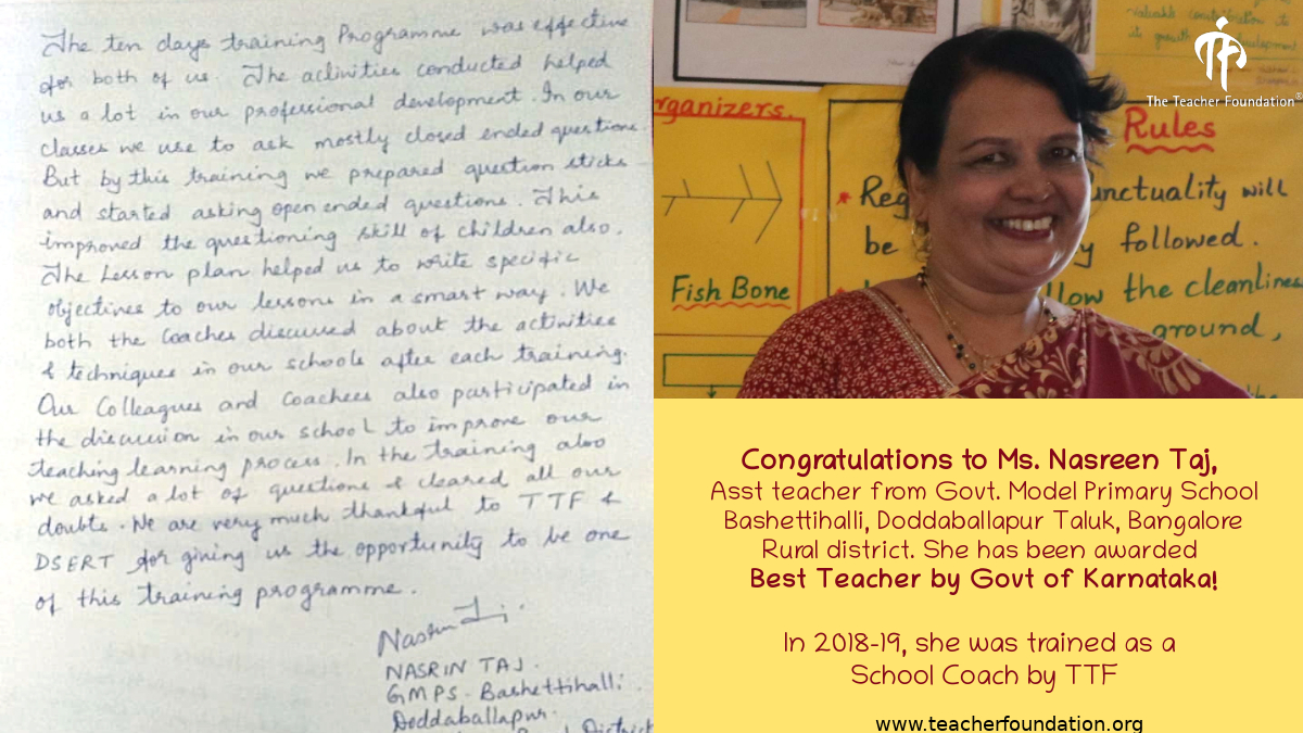 Ms Nasreen Taj, trained as a School Coach by TTF, wins the Best Teacher award