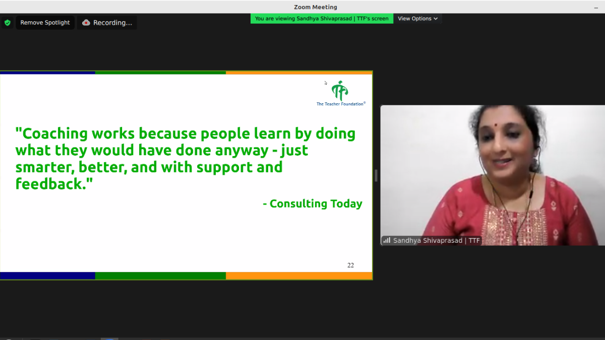 The Craft of Coaching webinar held on 1st Sept was attended by over 150 educators. Sandhya Shivaprasad, Head of Training & Content, TTF spoke on the importance of in-house coaches in schools and why schools should equip their senior staff to become Coaches. Coaching helps to institute a culture of ongoing professional learning and development among the teachers leading to better student learning experiences and outcomes. Every school needs to have a clear strategy of support and growth to enable every teacher to excel in their daily classroom practices.