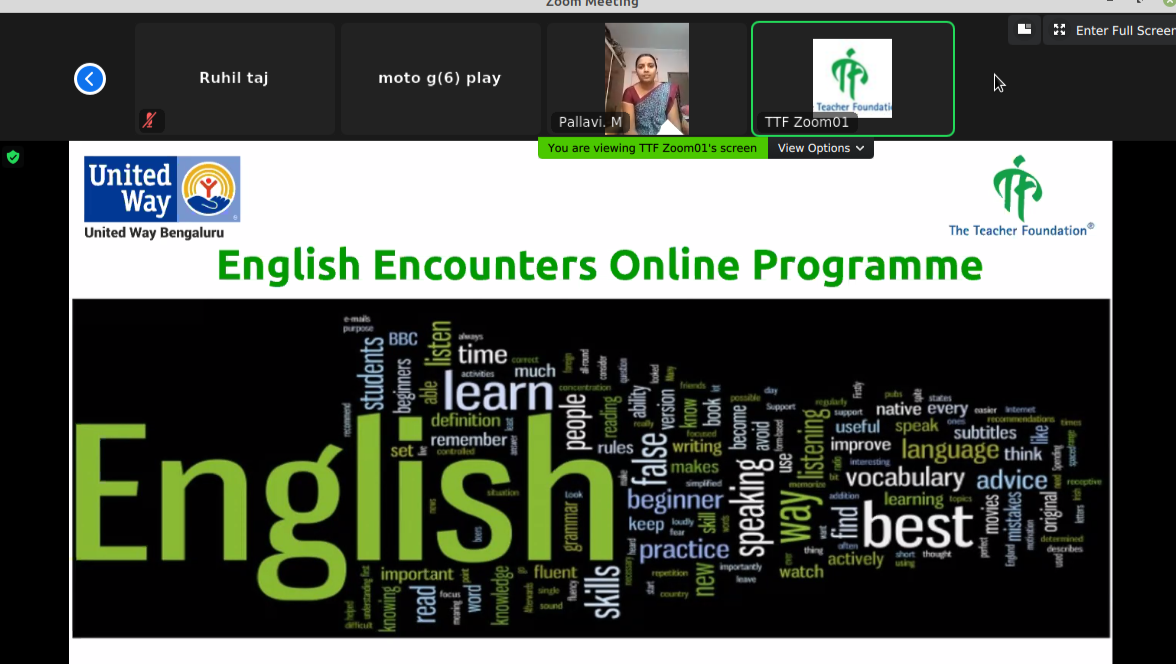 As a first in our online sessions with government school teachers, TTF launched English Encounters. This is in collaboration with DSERT & District Education Offices and support of United Way, Bangalore. 700 teachers from 5 districts in Karnataka are being enabled to enhance their proficiency in spoken English within a teaching context.